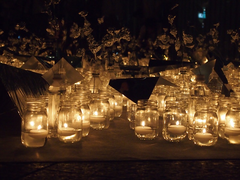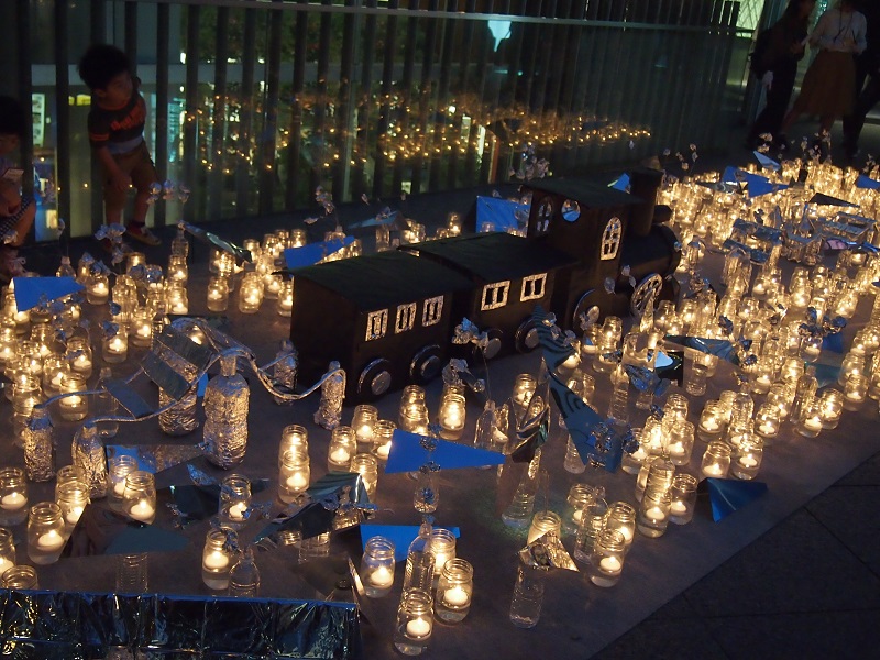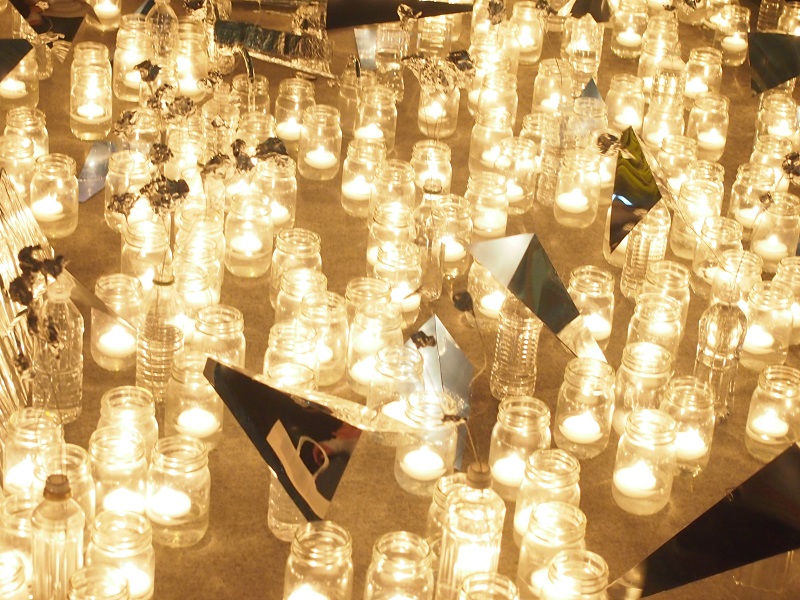 銀河鉄道さながら、汽車の造形物を中心に銀紙でレールを表現し、鳥の形にカットしたミラーや飛行機状に切り折りしたミラーがキャンドルのあちらこちらに配置されておりました。