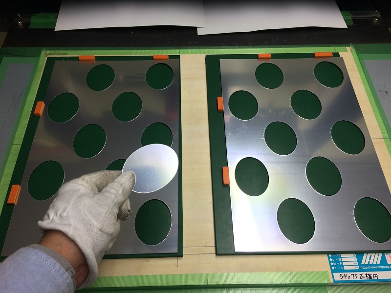 PET樹脂ミラー0.8㎜厚、楕円形で多丁付けトムソン抜きの実例↓