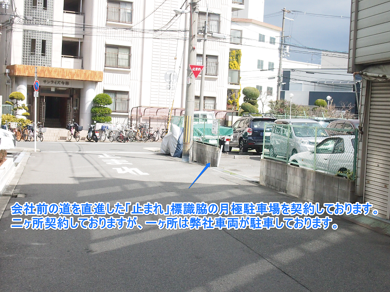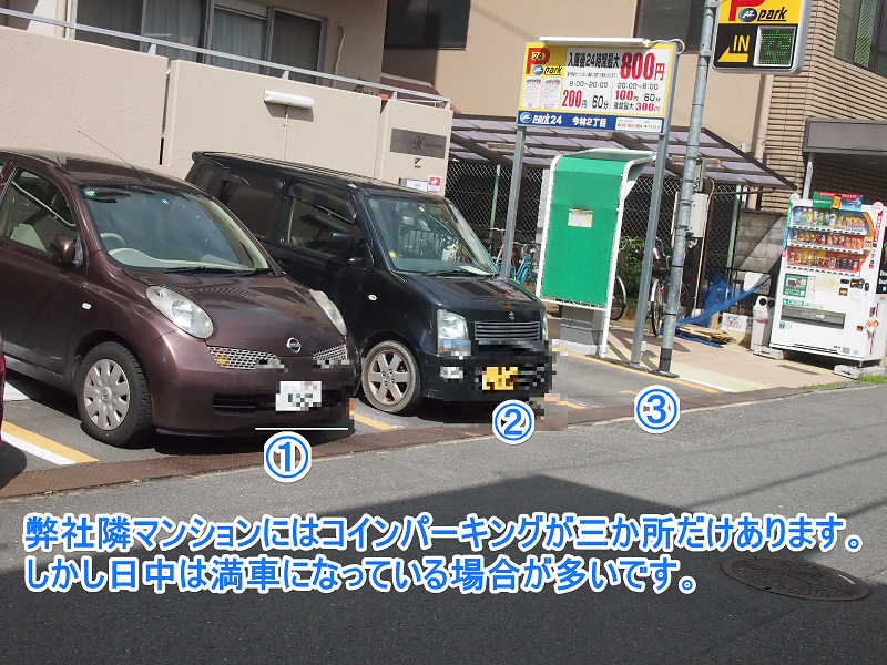 ②弊社隣のマンション下に駐車場がございますが、こちらは三ヶ所の駐車スペースのみとなっております。