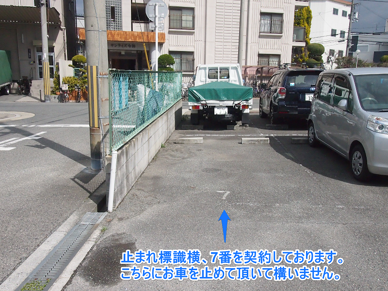 ④「止まれ」標識横の7番が弊社契約の場所になります。こちらへご駐車願います。