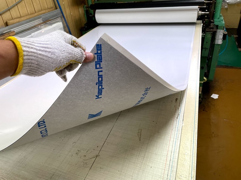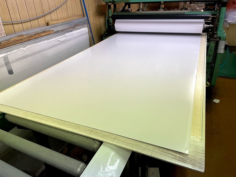 弊社のコア技術であるラミネート加工にて、片マットのPVC1.0㎜厚の3×6板に両面テープを全面貼りしていきます。