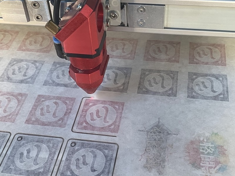 レーザー加工時の様子になりますが、印刷面に和紙アプリケーションを貼りその上からレーザーカットをしております。