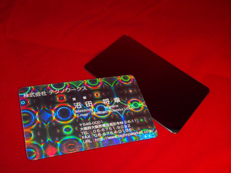 まず、営業目的でない場面や展示会の会場など、相対する方とあまり長く時間を取れない場面で、僕にとってはとてつもなくいい仕事をしてくれます。これ一枚をお渡しするだけで弊社の製品の立派なサンプルにもなりますし、フィルムラミネート加工とゆうあまり聞きなれない業務内容を非常に簡潔に説明する事が出来ます。また、特にアイキャッチ効果の高いホログラム柄を選んでおりますので非常に強い印象を与える事が出来ます。一期一会の展示会にて、逆に僕が興味を持ち立ち寄ったブースの出展社様よりお見積り依頼を頂戴したこともありました。