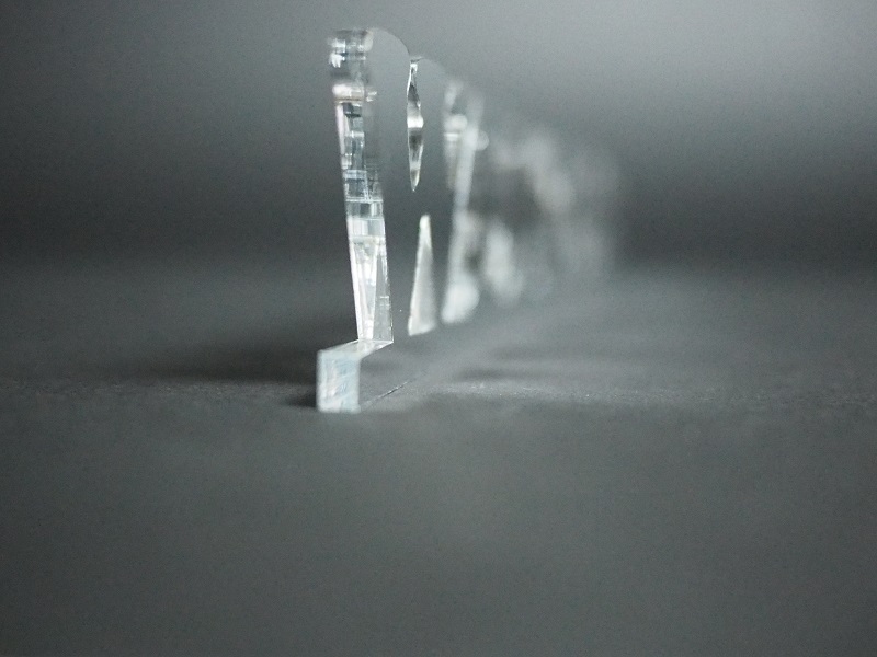 弊社のフィルム加工によって、鏡面が表にきて横から見た断面はご覧の通り下地のアクリルそのまま、クリアな透明となってます。