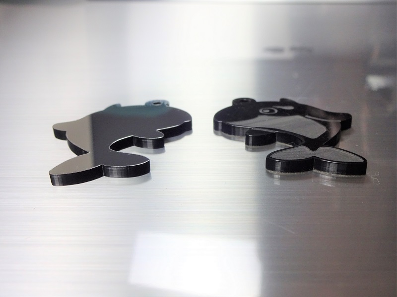 通常、ミラーでキャラクター印刷のキーホルダーを作るとなると、ミラー板と黒基材のアクリルをそれぞれ貼り合わせる必要があります。