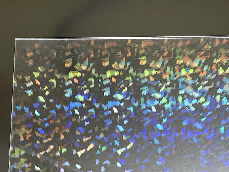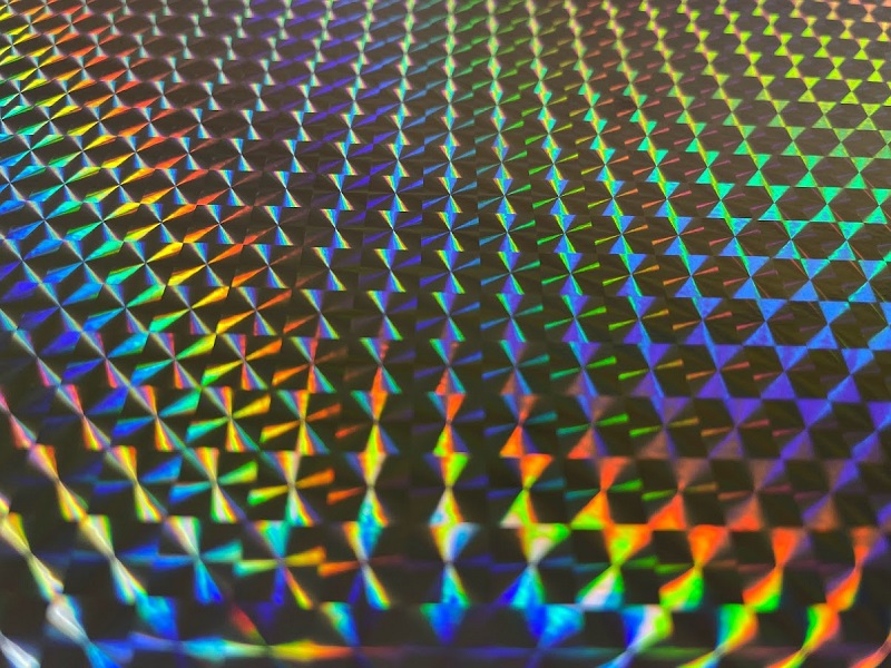 プリズム効果により光を虹色に反射するホログラムフィルムを樹脂プレートにラミネート加工致しました。