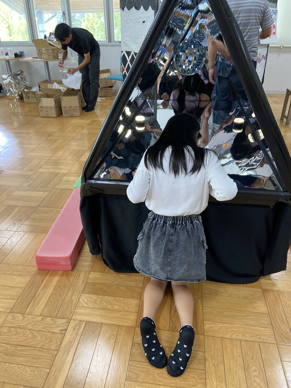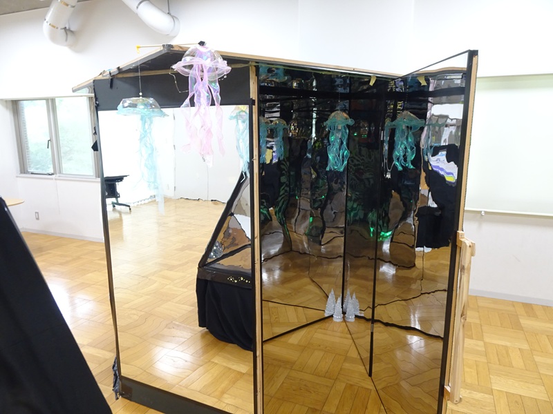 昨年度は4枚のミラーで約90cm四方だったけど、 今年は六角形構造にすることで、 入口からは直接見えない、 回り込むような空間が作られているもん。