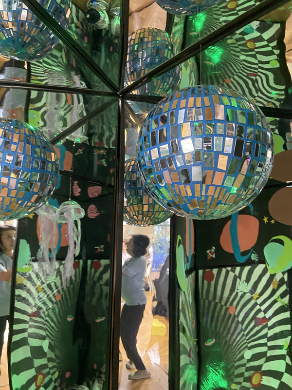 今回はね、設置場所も工夫されていて、 「でっかい万華鏡?」を覗くと、 となりに設置された**「鏡のへや」側面のミラー**に映った光も 一緒に見える配置だったそうだもん。